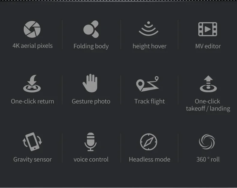 Adelante, atrás, girar a la izquierda, girar a la izquierda, volar hacia la derecha, rodar con un clic, rodar con patrón de 360 grados, modo sin cabeza sin brújula, regreso al vuelo con un clic y fácil recuperación. Control WiFi móvil, transmisión en tiempo real de pantalla móvil, modo de altitud fija, vuelo/voltaje estable, aterrizaje estable Cuerpo plegable, tamaño pequeño, fácil de transportar, función de temporizador automático, nuevo innovador modo de fotografía aérea